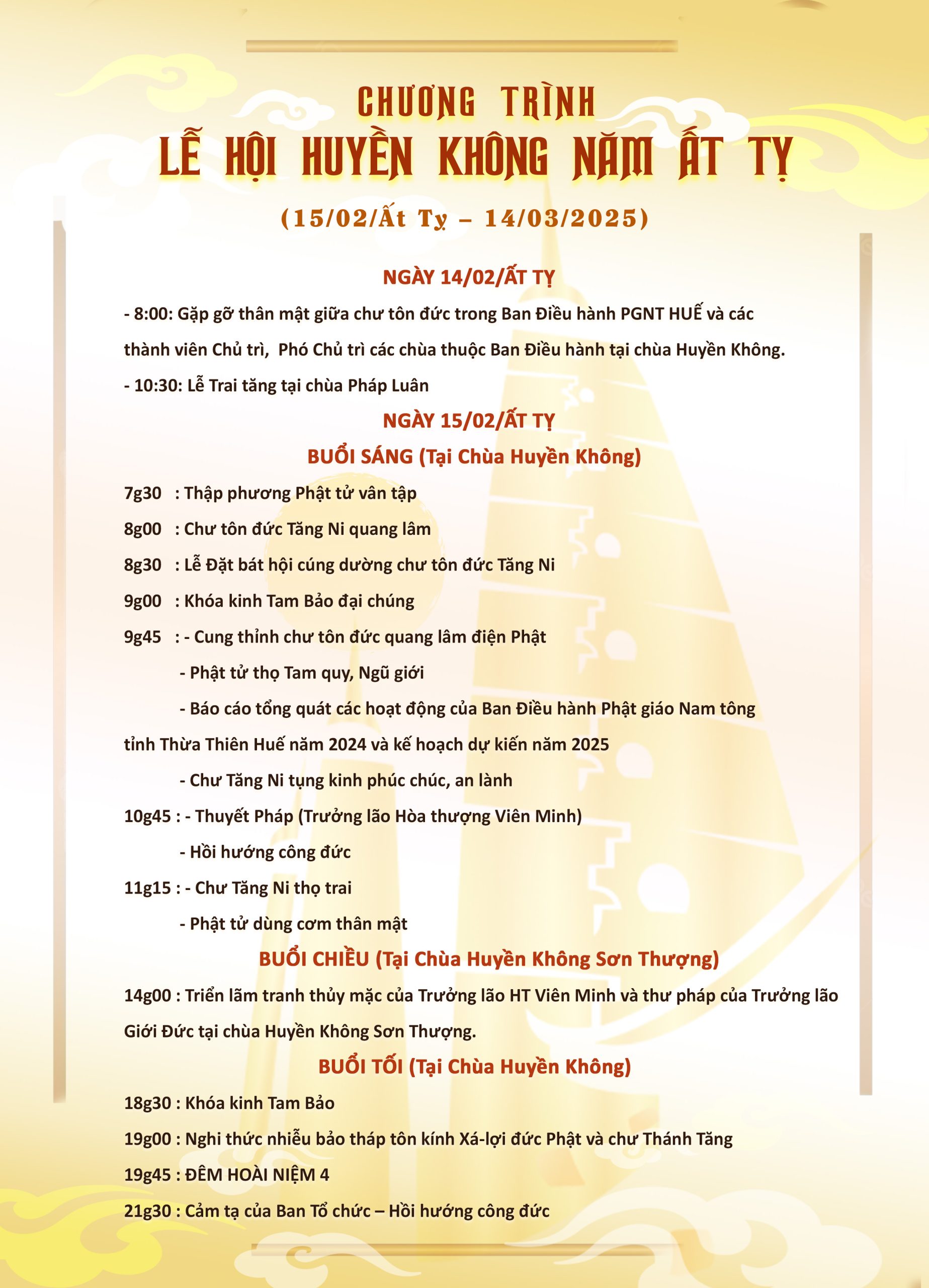 HomeTin tứcSinh hoạt tôn giáoChương trình LỄ HỘI HUYỀN KHÔNG NĂM ẤT TỴ (15/02/Ất Tỵ – 14/03/2025)Chương trình LỄ HỘI HUYỀN KHÔNG NĂM ẤT TỴ (15/02/Ất Tỵ – 14/03/2025)Sinh hoạt tôn giáo / By ChuaHuyenKhong / 12/03/2025 12/03/2025